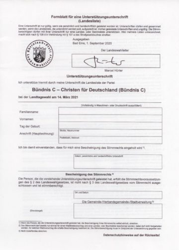 Die Formulare für Unterstützungsunterschriften sind in Kürze hier über die Seiten des Landesverbands Rheinland-Pfalz herunterladbar. Wenn Sie Wahlberechtigte kennen, deren Hauptwohnsitz in Rheinland-Pfalz liegt, wären wir dankbar, wenn Sie alle, die Bündnis C unterstützen möchten, darauf aufmerksam machen!